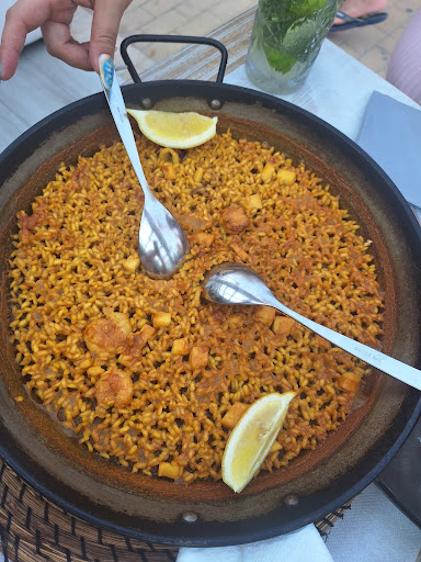 Read moreWe ordered a paella for two for more than 30€ and got a pan full of rice and octopus and 2 shrimps. I asked why there is so little shrimps and nothing else and octopus, the lady told me she doesn’t know she’s not the boss here. When we ordered earlier the waitress said it’s a paella with shrimps and the crayfish. I asked her what’s the differences to the other paella she said it’s the same only in this paella the meat is pealed. I showed her the picture of their poster at the front, we want that (first picture I posted). She said that’s it but only pealed. We got 2 shrimps and nothing else, no crayfish, paid over 30€ for that. I wasn’t happy at all but no waitress cared enough to do something about it. One server told me the cook would have missed the fact they put only 2 shrimps in there, that happens sometimes. At the end I ordered some salmon (18€) and got a plate with a piece of salmon and bell pepper to that. Two drinks and the starter (nachos) and the bill reached 75,90€. My daughter was exited for the shrimps and crayfish, instead we paid an extreme high bill and left with dissatisfied half full stomachs. Really bad service and no will to be fair and give at least a reduction of the price. No tip, no recommendation to go there unfortunately. Second photo is what we got. Really sad and that for 75,90€....