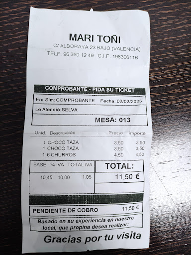 Read moreEntramos a este sitio a tomar un café, y una vez allí vimos que servían chocolate con churros. Pues tocaba probarlos, y maldita la hora. Nos sirvieron dos tazas de chocolate aceptable, sin más, acompañadas de unos churros raquíticos, frios y rancios como ellos solos. Le comentamos a la chica que estaban malos y fríos y nos dice que procede a cambiarlos. Creo que se dieron cuenta de lo que estaban sirviendo ya que tiraron todos los churros que tenían, y cambiaron el aceite de la freidora. Tras 25 minutos de espera, y varios minutos más viendo nuestro plato de churros en la barra sin que nadie se dignara a traérnoslo, por fin nos los acercan a la mesa. Esta vez si estaban calientes, pero hasta ahí las mejoras. La masa interior del churro era una mezcla entre plastilina playdooh y argamasa a medio secar, y la de fuera, un baño en un aceite con más kilómetros que el R6 que tenía mi abuelo en el campo. Un auténtico despropósito y una bomba para cualquier estómago. Para hacer el momento más agradable aún, junto con los churros nos traen la cuenta: 11,50 euros por las dos tazas y los 6 churros malos, pequeños y tardíos. Después de todo esto, nos disponemos a ir a la barra a pagar (ya que el pago se hace mediante máquinas automáticas), y la chica tiene el pequeño descuido de un lugar de 11,50 (que ya es una buena tomadura de pelo), marcar 35 pavos. Tan agusto se quedó. Pues nada, espera a que llame por teléfono a un encargado que pueda solucionar el error, para volver a poner el importe correcto. Conclusión, un sitio anclado en el pasado, con una decoración de la época del aceite donde fríen los churros y una atención justita para pasar el día, acompañada de un producto de calidad homicida y precios abusivos. PD: nos encantó que en el ticket nos preguntaran qué propina deseábamos realizar. Vaya...