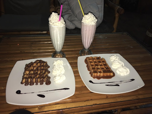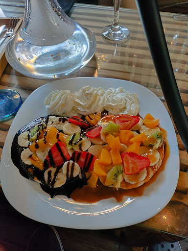 Read moreLo recomendamos para merendar porque tienen una súper oferta de 4 euros crepe o gofre + zumo o batido por sólo 4 euros y está bastante rico lo que se oferta por un precio bajo. Pero no lo recomiendo para ir a tomar cocktail por la noche y os comentó la razón. Fuimos 4 personas, pedimos 4 cocktail de la carta, la camarera no tenía mucha idea a la hora de recomendarnos o sacarnos de dudas, pero lo peor vino cuando nos trajo los cocktail, nos trajo dos los repartió y después los otros dos, y ahí comenzó el juego de los cocktail: Que sí este no era tal sino cual, que si este no era el tuyo sino el de ella, etc. Al final los probamos y no creíamos salvo uno que estuvieran bien repartidos, la avisamos y vuelve a intercambiar 3 de los 4 cocktail entre nosotros, teniendo que llamar al que los preparó para que él intenté hacer bien el reparto....y creo que él mismo tampoco lo tenía claro al ser dos vasos iguales. De todas formas de los 4 cocktail, sólo uno se terminó, el resto se quedaron sin tomar por su sabor. Uno era demasiado espeso y los otros dos no tenían buen sabor para nada. Nos pusieron un platito con chucherías y nos dijo algo de darnos unos chupitos por las molestias pero no se materializó. Además se junta en el ambiente el humo de las cachimbas de otros clientes y parece que estas en un submarino. No volveremos a tomar algo, como...