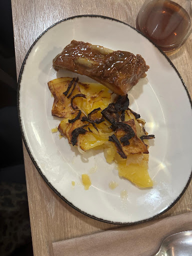 Pasan otros 15 minutos y empiezan a llegar los primeros: El “all y pebre” en un cuenco (donde cascas los huevos para hacer tortilla) y ningún plato bajero debajo. Mi padre, gran comedor, apenas lo probó. Los tacos de corvina eran 4 trozos en tempura, secos, dejados caer en el plato, con un mazacote de mayonesa, sin ningún tipo de presentación (lástima no tener foto) La costilla laqueada fueron 2 huesos por persona, con patatas panadero quemadas y cebolla que no estaba bien cocinada (adjunto foto) El arroz comestible, pasable si se trata de una casa de comidas. Estaba el grano pasado por fuera y duro por dentro. Una vez más, trozos cortados de gamba por encima.