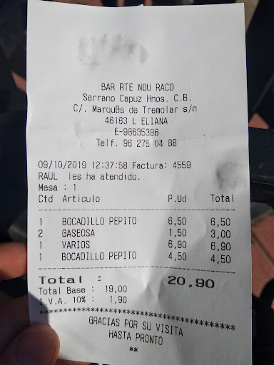 Read moreFatal! Por donde empezar... Comida de muy muy mala calidad. De entrantes una ensalada (dícese de un poco de lechuga con 3 rodajas de tomate, 3 Olivas y mucha cebolla..nada más, así tal y como sale de la bolsa) Unos mejillones que de lejos se olia que no estaban en condiciones para ser consumidos, y para acabar un gazpacho agrio que te dejaba con un sabor de boca indescriptible. De plato principal pedimos una paella y un arroz negro. Ninguno de los dos platos tenía sabor... Ni sabor ni sal ni nada. Sabemos que por ser de Valencia no tiene porque ser la mejor paella de tu vida pero tampoco pensabamos que sería la peor. Bien, eso la materia prima, si seguimos por los camareros el lugar se corona. En nuestra propia cara le dijeron a la mesa de al lado (que llegaron después que nosotros) que como siempre les atenderían los primeros... El resultado es que mientras que a nosotros nos traían los entrantes ellos ya acababan el principal. Vergonzoso... Finalizamos diciendo que el camarero nos quería cobrar de más y no nos dió tiquet, por suerte nuestro sentido común nos dijo que dos refrescos por 8€ no era lógico y cuando reclamamos sin problema nos devolvió la diferencia que eran 4€. Obviamente no lo aconsejo, todas las mesas opinaban...