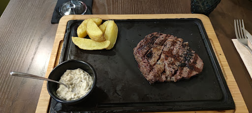 COMIDA: Precios excesivos para la mediocre calidad que ofrecen y las porciones de broma. La porción de 27€, vedla vosotros mismos (foto): una carne gomosa al cortarla, dura, desabrida (claramente descongelada) y acompañada POR 4 PATATAS. Si, CUATRO. Totalmente ridículo. CUANTO MÁS PUEDE COSTARLES UN ACOMPAÑAMIENTO UN POCO MÁS DECENTE EN UN PLATO DE 27 €??? Yo lo pedi bien cocido y me llegó mitad punto medio / mitad bien cocido. Mi pareja pidió punto medio y estaba crudo. Tuvimos que devolverlo.