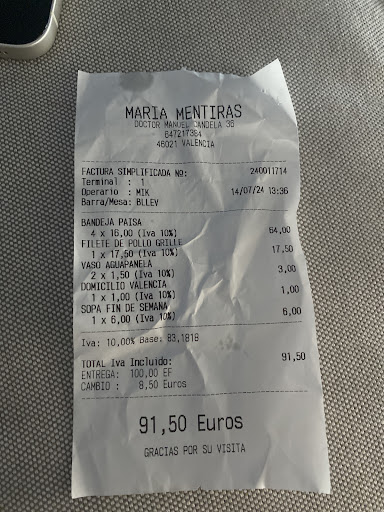 It’s my first time visiting Valencia, so I found this restaurant on google when I searched specifically for Colombian restaurant. I went there with exitment to try new food. Unfortunately, when I got there the atmosphere was so unwelcoming. The lady at the restaurant didn’t even bother to come to the door to welcome me and give me a site. She asked me something in Spanish. I told her no Spanish I said “ English?” She said no English still from afar. She made me feel like as I was a beggar or a kid he was there to run an errand. I’m a 30 yrs old guy. It is not about the language.. we could have some how communicated. It’s about the unwelcoming atmosphere. I left right from the door....