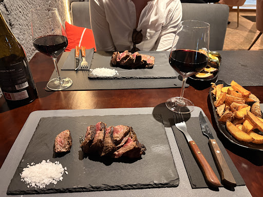 Pedimos un Tomahawk que, según el camarero, pesaba unos 1.200 g, pero la realidad fue muy distinta: apenas unos 8 trozos finos de carne, con el resto siendo hueso y grasa. El precio — 69 € — absolutamente injustificado.