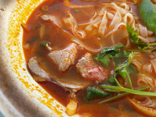 Minutes later, they delivered my delicious dish. It was red with little bits of sausage in it. I started with the sausage and... oh my, that had some kick to it. The sausage? No. The broth. I had a sip of broth. Y'all, it's literally liquid fire.