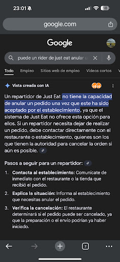 Hemos pedido por Just eat, después de 1 hora de espera, nos llaman para decirnos que no hay uno de los postres que hemos pedido de manera muy prepotente y desagradable, la única solución cambiar de postre (cosa que hemos rechazado). Tras iniciar la conversación con just eat (ya vamos por 1h y media) derrepente nos cancelan el pedido. Llamamos para saber qué ha pasado y nos dicen que el repartidor ha cancelado el pedido por nosotros cosa que NO PUEDE HACERSE, el pedido estaba asignado y en marcha. Después de 2 horas, tres llamadas muy desagradables para discutir con el local que ojo, querían a toda costa tener razón y nos han llamado hasta ellos para seguir con una discusión que no iba a ningún lado y que nosotros no queríamos tener. A veces hay que saber disculparse por el contratiempo y no seguir molestando. En resumen, que después de dos horas nos hemos quedado sin cenar porque no tenían un producto que si ponen en just eat que tienen disponibilidad. ( Just eat nos ha confirmado que el rider no ha sido quien ha cancelado el pedido por si habían dudas) Actualización: como me habéis respondido de nuevo que el repartidor es quien ha anulado y seguís sin asumir la responsabilidad… procedo a poner la búsqueda rápida donde claramente explica que el repartidor en ningún caso puede anular un pedido aceptado y es el restaurante quien lo hace. El pedido ha llegado y lo habéis empezado a gestionar ya que nos habéis llamado sabiendo que habíamos pedido y teníamos la notificación de aceptado. (Además una vez sabéis la orden y nuestro contacto es porque el pedido os ha llegado al local). Creo que esta disputa deberéis tenerla con quien gestione los pedidos del local y con la persona (vuelvo a repetir) que ha sido muy desagradable...