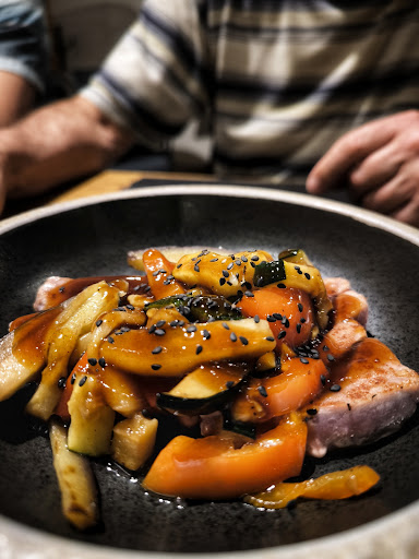 En general la experiencia fue buena, probamos los siguientes platos: Crujiente de pato, cebolla y foie con salsa de manzana. Está bien pero me esperaba un sabor mas interesante. Ensaladilla rusa. Un plato suave, para mi gusto se sirvió demasiado atemperado y faltaba un poco de sabor, además vino con cuatro totopos de maíz, la ensaladilla deberia servirse con suficiente acompañamiento para dipear. En general un plato suave de sabor pero agradable . Croqueta cremosa de gorgonzola y espinacas. Muy buen sabor y textura crujiente exterior que combina muy bien al morder y mezclar en la boca. Bacon crujiente con camembert y mermelada de tomate. Me decepcionó, por lo aceitoso que estaba el bacon y la falta de sabor del queso, le faltaba intensidad, sin embargo a mi mujer le encantó. Pulpo con crema de patata. Para mi fue una gran decepción por la escasez de la ración y el sabor. La textura perfecta pero el sabor aunque se notaba el ahumado, no se notaba apenas la miel y le faltaba intensidad también. Bao negro de rucula y pulled pork. Este plato si que fue un acierto. El pan bao muy bueno, textura crujiente exterior y blando por dentro, con el pulled pork con un sabor muy logrado a barbacoa que no es para nada saturado. Entrecote con verduras y patatas. Buen punto y buen sabor, aunque el corte para ser un entrecote era demasiado fino para mi gusto. Le falta acompañamiento de verduras y patatas que son muy escasas. Tataki de vaca madura. Este plato fue una decepción por las expectativas. El sabor de la salsa era demasiado intenso, esto impedía saborear la carne adecuadamente. Además el corte tenia demasiadoa tendones, no es un corte apropiado para un tataki que se sirve marcado y crudo por dentro, un tendonyno puedes masticarlo crudo por lo que comerse la pieza resultó bastante dificil. Tarta de queso y oreo. Muy buena combinacion de sabores y texturas. Tarta de queso y lotus. Increible, muy muy buena, textura cremosa y sabor intenso, el mejor plato para el final, sin duda nos quedamos con buen sabor de boca gracias al postre.