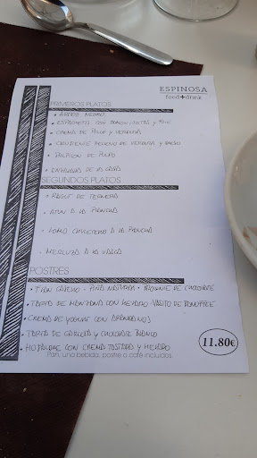 I've been back twice to "Restaurante Espinosa" and definitely am going again. In the morning between about 8am and 11:30am they do "breakfast". It consists of a variety of choices of dishes they prepare for that morning. Not a fixed menu as such. In the afternoon around 1pm they start "lunch" with different dishes. As you enter, you can see the different foods being prepared for serving. My first visit I had calamar in a flavorful brown sauce, with green pimenton peppers, tasty not spicy. Including the coffee "cortado" it was only €7. Nice value for the price. The second visit was meatballs in a mild sauce, also very good, and a mushroom tortilla. The tortilla was good but a little salty fir my taste. None of the other dishes were salty, to me. Note that some dishes are served at room temperature, but if you'd like them warm all you have to do is ask the waitress. The table service was friendly and efficient. Since the food, service and atmosphere are all excellent it can get pretty busy-- but the wait time wasn't much. My first visit I didn't understand how to order. Basically you sit at an open table, or a server will seat you, and you can show the server what you want up at the food prep counter. You could also take pictures if that works...