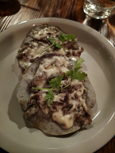 We ordered the chicharrón de queso, which was very tasty. It came with 5 salsas ranging from Habanero down to a mild red, my husband especially loved the habanero and said it was the best salsa he had tried in Spain. I ordered a small plate called costra de bistec, which was very good. My husband ordered volcán con bistec and my friend the gobernador, and both enjoyed theirs as well. Finally we each ordered a different dessert and all were very good. We got a pastel de chocolate, ate con queso, and gelatina de vermouth. The drinks were very good as well, my husband especially liked the Acapulco baby Mango. Service was wonderful despite them being rather busy. We booked a same day reservation at 7:30, and we were thankful we did, most of the tables had reserved signs on them when we arrived. We will for...