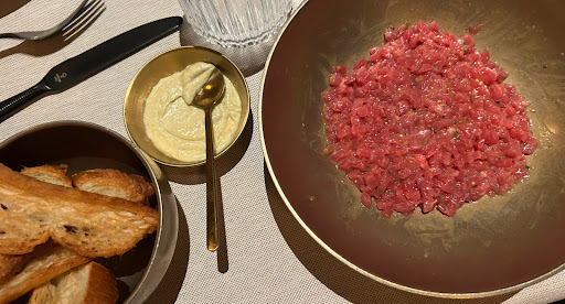 Como bienvenida, nos ofrecieron un aperitivo de anchoas extraordinariamente crujiente y delicado, con un equilibrio perfecto en su textura y en el punto de aceite, lo que lo convertía en una delicia sorprendente. A continuación, pedimos el steak tartar, preparado al momento frente a nosotros, permitiéndonos personalizarlo según nuestro gusto. El plato, servido con una salsa exquisita y unas tostadas crujientes de cruasán que aportaban un sutil toque dulce, era sencillamente sublime. La cantidad era perfecta: ni excesiva ni escasa. Destacaban el equilibrio en la sal, pimienta y acidez, y la combinación de todos los elementos generaba una sinergia de sabores inesperadamente deliciosa que nos dejó deseando repetir.