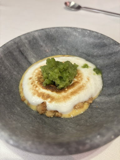 Cremoso de Hongos, Cebolla Asada, Anchoa y Castaña (El mejor plato de la comida) En lo que a textura se refiere es un plato que cautiva desde la primera cucharada. No obstante sí que es cierto, que aunque el cremoso de hongos solo ya estaba bueno, no es hasta que la anchoa entra en la ecuación cuando el plato se vuelve verdaderamente fascinante. No es el plato de tú vida, pero esta bueno y de por eso no le puedo dar otra puntuación que un..