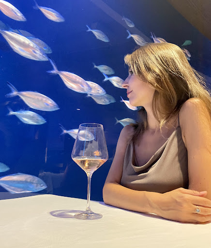First point, it's not a submarine restaurant. After you've visited the Oceanographic with long tunnels underneath the fishes you'd expect something similar. Instead the dining room is next to the aquarium, not below it. So technically not "sub" marine, as you have no water above you.