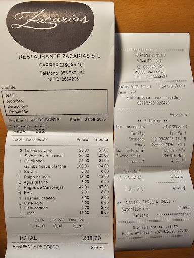 Comida familiar en Zacarias ,segunda visita en 2025 , la ultima en Fallas . Reserva a las15:00 despues de viaje complicado llamo con antelación avisando que me retrasaría 15:20. Se me informa que cocina cierra a las 16:00 .Mi familia entra por la puerta del restaurante a las 15:11 despues de dejar a mi madre en la puerta por su edad y mobilidad reducida .Atencion primer camarero correcta y educada , pero volviendo a recordar antes de tomar nota que la cocina cierra a las 16:00 (se toma nota a las 15:25) .Se dispone en mesa de una sola vez todos los entrantes y pido porfavor que la gamba se retrase a que podamos terminar los entrantes porque sino habría sido despachada . A partir de aquí la comida (celebracion familiar con mi madre de 87 años , avisado en la reserva) se convierte en un acoso de acciones para presionar a que se terminasen los platos y insistiendo en la retirada de los mismos de forma impertinente pasando un camarero cada 3 minutos por delante de la mesa para ver si podia retirar algo y hasta en 5 ocasiones tengo que llamar la antencion que no se retiren platos ya que no se ha terminado la consumición .Se presenta el pescado y aunque había pedido primero tomar el pescado y luego la carne , accedo a que se traiga el pescado y la carne a la vez para evitar nuevas escenas de acoso y presion para terminar la comida .Error , se trae pescado y carne a la vez y se continua casi con mas insistencia , y ahora ya mala educación e impertinencia , intentando retirar los platos sin terminar de comer o incluso con comida en el plato .La situacion continua y se me indica que el restaurante cierra a las 16:30 y que por “deferencia nos estan atendiendo” , llevábamos una hora escasa de comida. Sin duda si se me informa que disponia de 1 hora para comer no mantengo la reserva .El punto final de mala educación lo puso un camarero que solo nos atendio en los cafes y que parece que venia con el objetivo claro de echarnos de la mesa .Pido un café y copa Zacapa ,nada mas ponerse en la mesa comienza a retirar los vasos de agua algunos de ellos llenos sin preguntar sin contemplación alguna ,a lo cual le indico que no es correcto y que respete la sobremesa .De una forma agresiva me contesta que vayamos terminando ya y desalojando la mesa o lo cual le respondo que no es correcta su manera de dirigirse a nosotros y exijo unas disculpas .No solo niega haberme intentado echar cuando toda mi familia lo escucho sino que se negaba a pedir disculpas y me mira con actitud desafiante y agresiva .Para calmar la situacion y quitarle hierro pido porfavor si puede tener la deferencia de servirme unas gotas mas de ron solo para terminar el segundo café . Objetivo de la peticion , ver si era capaz de entender que el servicio no había sido correcto y que sin ir mas allá y terminar la comida tranquilamente el cliente agradecería un detalle–disculpas por el transcurrir de la comida .Vuelve con el segundo café y nada mas dejarlo en la mesa me retira la copa de ron de malas maneras , a lo cual le inquiero si mi petición iba a ser atendida y me contesta de forma sea y agresiva que no .Zacarias ha perdido el trato personal , matiene una calidad correcta del producto , pero un negocio que se precie si quiere tener el status de "otros" restaurantes no puede contestar a un cliente que celebra un acontecimiento personal con una persona de mobilidad reducida de 87 años que “su jefe les obliga a cerrar a las 16:30”.Salimos del restaurante a las 16:53 de forma precipitada y mientras me quejaba en la puerta al camarero inicial , el camarero “mal educado”se planto al lado nuestro para escuchar la conversación de forma desafiante-intimidatoria. No volvere, dejo constancia de mi experiencia para que otras personas no vivan la misma situacion y que la gerencia del restaurante adopte las medidas que considere oportunas para eliminar de su plantilla personas indeseables .Un clásico de Valencia se ha convertido en un sitio vulgar. Adjunto cuenta y tiquet parking por si desea ser comprobado por...