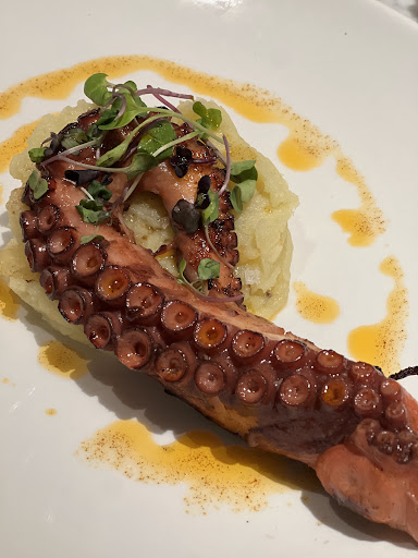 Read moreWe were looking for Sunday paella.. the outdoor table on the sunshine made us sit down right by the door but we didn’t get waiter attention for 15-20mins. After literally walking for menus we were able to order after another 15mins. Waiter was kind and polite but too many tables to look after. We were starving so got cesar salad and fried squid. The salad was absolutely fantastic presented like Michelin Star but there was barely some chicken pieces and only a little bit of mayo with the squid. Ordered paella València which came with just some calamari pieces I guessed- no chicken, rabbit or anything that was written on menu. Wanted to order coffee but it took another 15-20mins to get waiter so just asked for the bill. Toilet experience was shocking! It doesn’t reflect the price range of this place. I will not go to the details but not clean at all, no lock on the door, no soap…. If you want just glass of wine and people watching by beautiful fountain without anywhere to be in next 2 hours this might be the right place for you. Otherwise rollercoaster experience. Some heights like the view and food presentation and waiter personality and deep lows like the facilities, lack of service - staff and well we really didn’t get what we...