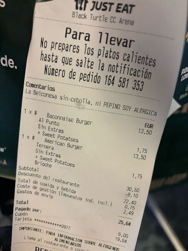 Read morePor dónde empezar? Un miércoles 19 estábamos en casa en calentitos, nos apetecía comer algo tranquilos con el pijama puesto y ver un rato la TV y se nos ocurrió pedir a este restaurante, un error fatal! Pedimos dos hamburguesas, yo que soy alérgica a la cebolla y pepinillos pedí y especifiqué que soy alérgica y que no podía comer (como viene detallado en el ticket de la foto adjunta a esta reseña) y mi marido pidió una clásica al punto.
