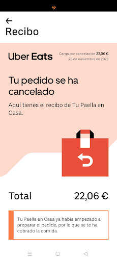 Read more3 pedidos realizados por Uber Eats: 1° Todo bien 2° Me llama para decirme que no tiene fideuá, que me ofrece otro arroz. Aceptamos. El arroz alternativo no vale nada, 2 trozos de carne pelaos. 3° Realizado a las 13:20 el domingo 26 de noviembre. A esa hora en Valencia aún estamos almorzando, pienso que es imposible que se le haya acabado la fideuá y la app deja pedirlo. Me llama para decirme que no le queda fideuá y me ofrece el mismo arroz. Le digo que ya nos lo hizo en el pedido anterior y no nos gustó que yo he comprado fideuá y si no me la puede enviar cancele él el pedido. Lo cancela indicando que lo he cancelado yo ergo, me pasan el cargo. Ahora ¿qué?¿me toca estar justificando en el banco que devuelvan el cargo y presentando mil formularios?. Edito: Finalmente tras hacer algo de ruido en redes sociales (X) Uber Eats me ha devuelto el dinero. Es un poco triste que no haya forma directa de arreglarlo con ellos y el establecimiento pero contento por el...
