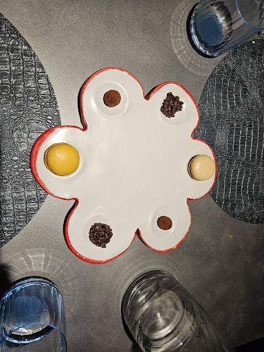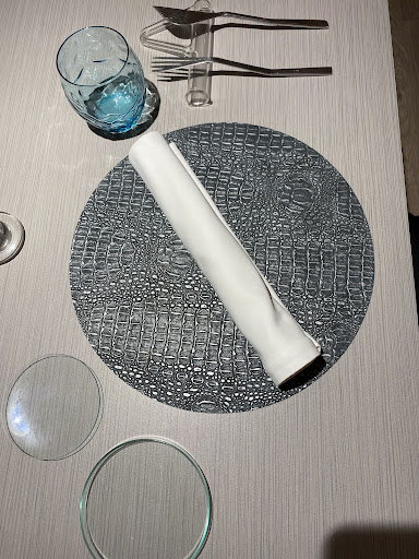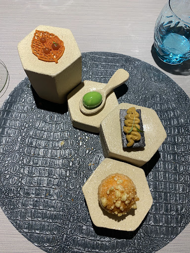 Comenzamos por los 6 aperitivos Maiz, Maiz , Maiz : Maiz en tres texturas ,unas esferificaciones de maíz liquido en un pan de maíz, al comerlo van explotando en la boca . Piedra de foie: Foie recubierto de una capa de yogur simulando una piedra. Un bocado muy rico , ojo no confundirse con el resto de piedras que son de verdad. Tomate , Atun : Un merengue crujiente de jugo de tomate con taquitos de atun y crema de aguacate. Croqueta de kimchee : Esta croqueta ya la había probado anteriormente en barra , ligeramente picante , se nota el sabor de la col , bechamel fluida , muy rica. Buñuelo de huevas : Un pequeño buñuelo relleno de crema fresca y huevas de pescado , un bocado bastante sabroso, la crema rebaja el sabor de las huevas. Tikka Masala , Yogur: Un mini taco con masa de wonton , una masa de pan china frita, relleno de pollo tikka masala . Estaba bueno pero me esperaba más potente el tikka masala. Seguimos por los platos principales Verdura anticuchera, patata , maíz : Una lechuga a la plancha con salsa de aji amarillo , mantequilla tostada y crema de patata con aire de cilantro. Este es uno de los que mas me gustaron, una mezcla estupenda, la mantequilla tostada le da un toque muy bueno al plato. Guisantes, navaja y curry verde : Magnificos guisantes , pequeñas navajas y un curry verde tailandes bastante suave. Sopa laksa , erizo : La sopa laksa es típica de malasia y Singapur,elaborada con leche de coco y en este caso erizo además de huevas de tobiko o pez volador. Muy sabrosa esta sopa, el sabor me recordó a la que probe en Singapur. Pollo frito , chili King crab: Pequeño bocado con una piel de pollo frita ,un trocito de cangrejo y una gota de chili Arroz , salmonete y lechuga de mar crujiente : Arroz elaborado al estilo caldero murciano , sabor bastante potente con dos bocados de salmonete estupendos. Muy rico este arroz. Socarrat , alioli : Cucharita presentando el anterior arroz a modo de socarrat con una puntita de alioli y un camaron en tempura . Flojo este plato, el arroz estaba gomoso. Los 3 platos siguientes forman uno solo en 3 tiempos Huevo, carabinero: Una clara de huevo frita con sus puntillas, una yema de huevo que realmente son los jugos del carabinero y la cola del bicho. Estupendo este plato, fue un de los que mas gustó a todos, estupenda esa yema. Pan marino: Pan estilo brioche con varios camarones en tempura. Perfecto para acompañar al huevo. Jugos braseados: Cabeza ahumada del carabinero la cual primero se estruja para que salgan los jugos al vaso de precipitado, luego se arrebaña todo bien y finalmente se beben los jugos como si fuese un chupito. Tremenda, merece la pena pringarse las manos.