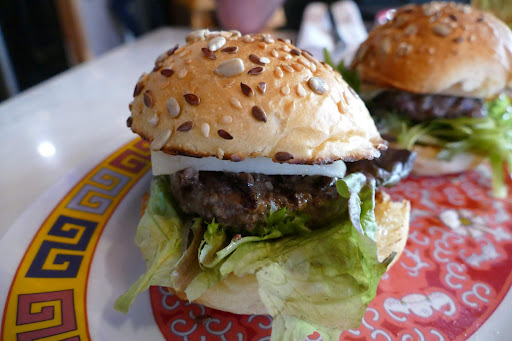-Hamburguesa : Esta es la versión en miniatura de la que quedo segunda en el concurso de España. Lleva carne de angus de Miguel Vergara, lechuga , queso oveja y una salsa.Buen punto de la carne , sabrosa , lechuga sobraba un poco. No estaba mal aunque fue lo que menos nos gustó de todo lo que probamos.