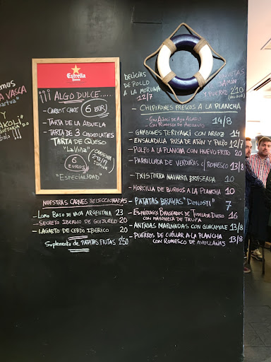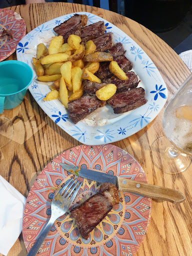 Sobre la comida pues haber, los chipirones estaban bien, pero pequeños y finos como para 15€ es decir racion un poco escasa , el pulpo con huevo muy rico pero muy muy escasa, y el lomo de vaca de sabor estába rico pero por dentro estaba frío, se nota que lo tenían en camara, y las patatas eran tipo gajo y congeladas, sigo sin entender que manía de no poner una patata natural, no unas patatas de lux del McDonald's, la tarta de queso muy rica , el vino de la casa pasable otro a 20€ la botella, se les va un poco la relación calidad/cantidad/precio...