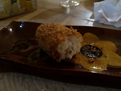 Dos croquetas de jamón. Rebozado con trozos de pan gruesos aunque luego es fino el rebozado. La bechamel esta cremosa pero no fluida, falta algo más de trabajo en la bechamel. Tiene pequeños trocitos de jamón.