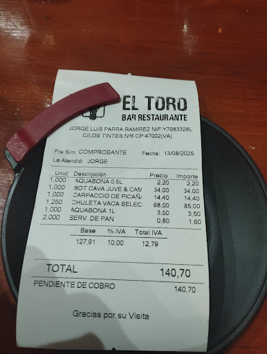 Read morePues ayer estuve comiendo con un amigo en este restaurante Toro, que la cornada q nos metió fue buena. A mí si me cobras un precio elevado por la comida quiero que sea porque me has servido una comida de calidad elevada y lo pago satisfecho. Pues previamente a pedir solicitamos la recomendación del dueño q está en la cocina por una carne. Y nos recomendó una chuleta de 1200 gramos, dudo del peso. Y así hicimos. Bueno la carne se hacía chicle totalmente, difícil de comer. Pedimos un vino espumoso 32 eur, no recomendable tampoco.. Y botella de agua q nos traen de medio litro para dos, nos la bre en la mesa. Después otra botella de agua y nos trae de 1 litro, ya abierta. Dudamos q sea agua mineral y probablemente del grifo La mesa sin un triste posaplatos , ya no un mantel.....con lo q el pan lo posas donde puedas. Por cierto el pan incomible. Demasiado alto el volumen de los comensales y casi tienes q hablar a gritos. Os adjunto la factura para ver los precios por una comida q no estaba a la altura del precio pagado. Como en muchos sitios poro trabajo y este no es recomendable por su relación calidad- precio. Tiene muchos q mejorar este...