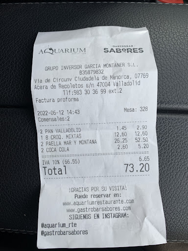 LA PEOR EXPERIENCIA EN VALLADOLID. 1 de la tarde, llamamos para reservar porque era de los pocos sitios que abrían el domingo. Llegamos, y nos dicen que solo tenían mesa en la terraza, pero el restaurante estaba vacío y no nos dejaban ponernos dentro, solo nos daban la opción de la terraza a 36 grados. El camarero que nos tomó nota fue de lo poco “a mantener”. En cuanto a la comida, pedimos croquetas, nada del otro mundo, bechamel muy grumosa con tropezones de jamón demasiado grandes y molestos, sabor sin más. El precio en la carta era de 12€, y después en la cuenta nos cobran 12,60€ (para mi, denunciable). Quisimos cerrar con un arroz de mar y montaña para dos personas, cuyo precio en carta era de 26€ (sin especificar que era precio unitario por persona), Cuando llega el arroz, la verdad es que la pinta es aparente, lo que deja muchísimo que desear es la falta de comunicación de la camarera, la cual la preguntamos si la lubina estaba hecha, ya que la vimos cruda y apenas medió palabra con nosotros. En efecto, la lubina estaba prácticamente viva, y nos confirman que ni si quieran la sellan en la plancha, va cruda. Vemos cómo la camarera le mete un palizon increíble al arroz. Jamás he visto semejante manera de servir un producto delicado y caro. Se te quitan las ganas de comerlo. Era una masa aplastada, con un arroz que lejos de estar suelto, estaba duro. La mezcla de sabores del arroz tampoco nos convenció. Mientras terminábamos, un camarero se da cuenta del desastre y nos pregunta en repetidas ocasiones qué tal todo. No sabíamos ni dónde meternos. Para rematar, nos llega la cuenta, habiéndonos comido un tercio de arroz. Un total de 73,20€. Resulta que el precio del arroz en carta es precio por persona, cosa que en ningún momento se indica ni se nos avisa. Supongo que buscando la pillería. Por lo tanto, el precio inicial de 26€ que teníamos en mente, sube a 52,50€. Encima te cobran más de lo que pone en carta. Salimos por patas de aquel espantoso lugar. Parece una película de miedo, pero es GASTROBAR SABORES VALLADOLID.