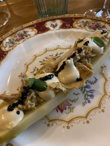 Taco de carnitas con cola de cigala, ajo negro y cebolla encurtida. El plato estrella de la comida, un lingote de carnitas, crujiente por fuera con una cola de cigala cocida, salsa de ajo negro, brotes y cebolla. Muy bueno, eso sí, el taco más caro que he comido nunca jeje.
