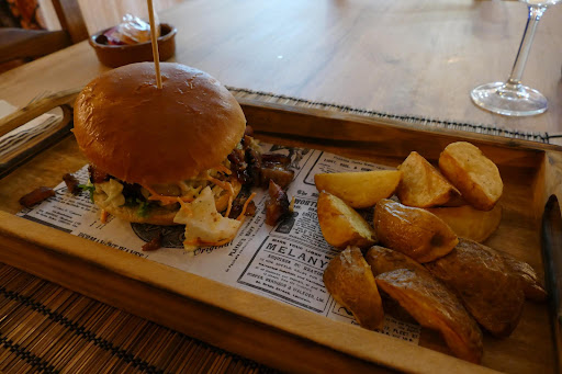 La hamburguesa Carolaina Burger , una hamburguesa con carne de ternera , unos 180gr, tacos de cerdo ahumado , ensalada de repollo y zanahoria , rucula , mayonesa agridulce y provolone ahumado. Una buena hamburguesa , el cerdo ahumado estaba bastante bueno , el sabor del queso me gusto bastante, el resto de ingredientes acompañaban correctamente. La carne de ternera la pedí poco hecha , salio mas o menos al punto , la carne estaba demasiado prensada algo que no me gusta mucho, de sabor estaba bien.Pan correcto. Se acompaña de patatas gajo con las que me pusieron un poco de salsa de cilantro que estaba rica.