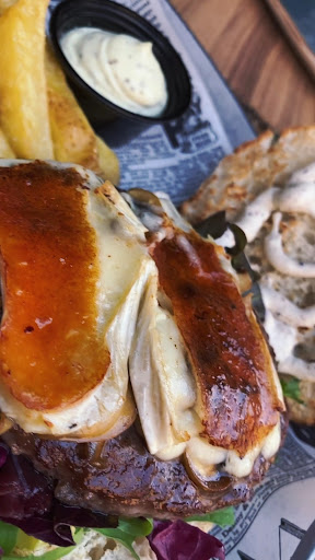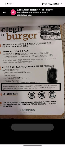 Hamburguesa Carmelo de ternera en pan brioche que lleva lechuga , bacon , queso cheddar , cebolla caramelizada y salsa burger. La carne me pareció de las que vienen ya congeladas, muy picada , pasada. La cebolla demasiado dulce , es posible que sea de bote.El tomate cortado demasiado grueso y apenas encontré el queso.La salsa también estaba demasiado dulce. El pan no estaba mal.