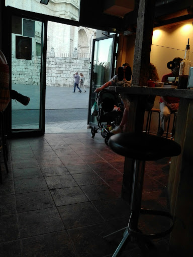 Es un local pequeño, sin mesas, con lo que comes en barra, con sillas altas si tienes suerte. Las vistas son inmejorables. Grandes ventanales mirando a la catedral y la iglesia de la Antigua.