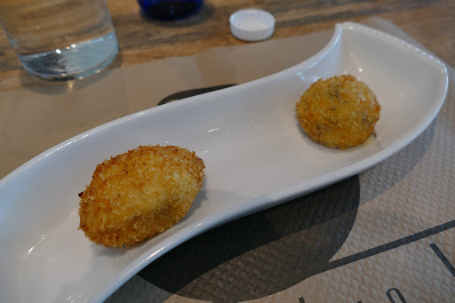 -Croqueta de cecina y de jamón. Croquetas de tamaño normal rebozado fino y crujiente, bechamel cremosa con pequeños trocitos de jamón y de cecina, sabor bastante suave de la bechamel. Notables.