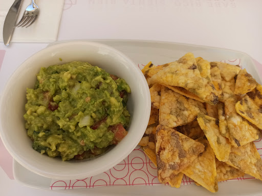 Avocado dip, guacamole con totopos de legumbre. El guacamole recién hecho, cosa a valorar. Aunque no lo recomendaría porque tenía un sabor picante que no supimos distinguir, lo cual "mataba" todo lo rico del guacamole (nos gusta el picante, pero aquí, ese en concreto no nos gustó).