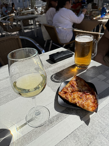 Read moreWe ordered a large beer and a glass of white wine to start with drinks. We got two complimentary slices of really great pizza with the drinks. The pizza was really thin and crunchy which we both loved. Must come here some time for pizza I guess :) For lunch we got Croquetas caseras de cecina (I think this is with some type of dried meat but not jamon, we still liked them but I love jamon so was hoping for that) and Ensalada de pasta César (this was quite a huge plate and also quite a treat). For a quick bite at lunch I would definitely...