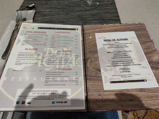 La carta tiene unos cuantos platos , dividida en 5 secciones , entrantes , platos de pescado , platos de carne , una sección dedicada al bacalao y los postres. Además hay un menú que tiene 1 aperitivo , 3 entrantes , un principal a elegir y postre, bebida aparte.