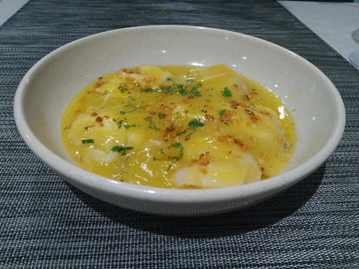 Como plato principal elegí el bacalao estilo taberna. Una buena tajada de bacalao con un pil pil y un majado de pan tostado , frutos secos y ajo . El bacalao estaba perfecto de punto , pil pil muy rico y todo mezclado con el majado quedaba estupendamente. Un plato redondo.