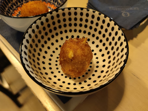 -Croquetas de gambas , con mayonesa, las croquetas bastante densas la bechamel , nada parecidas a las que había comido hace unos años bastante mas cremosas , la mayonesa tampoco aporta nada.
