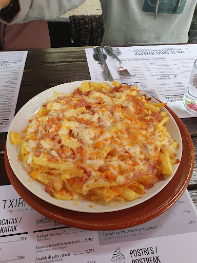 La comida... bien, pero nada del otro mundo. Las patatas con queso que eran como entrante, Bastante normales, como las que harías tú en casa en la airfrier por ejemplo. De cantidad ok. Las hamburguesas (la mía, la smashed) salió algo fría, ya que esperaron a sacar todas las hamburguesas a la vez. Una hamburguesa buena (para mi gusto un 7/10) con pan Brioche, pero que de cantidad se queda bastante corta, no es muy grande. La que si que era grande era la Txiriburger.