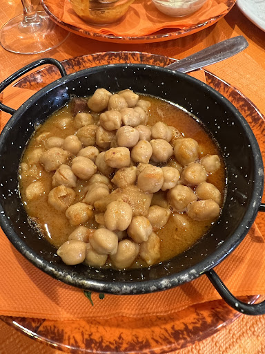 Pedimos pulpo guisado, ensaladilla y garbanzas como entrante. El pulpo en su punto con unas pimientas picantes de escándalo. La ensaladilla servida con huevo duro, de las mejores que he probado nunca, y las garbanzas caseras y con un sabor muy propio. Todo exquisito.