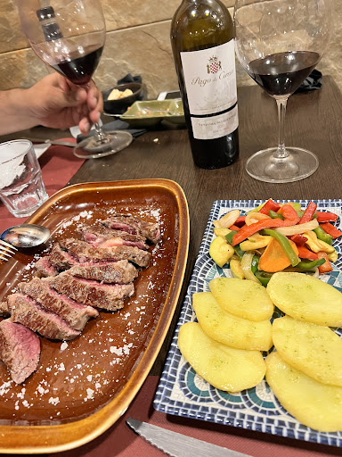 Steak tartar: nos lo habían recomendado y ya sabemos por qué. El chef ha hecho un balance excepcional de ingredientes y condimentos para elevar un corte de carne que podría brillar por sí mismo. He pagado el triple por un tartar en otros sitios y preferiría este sin dudarlo. Crujientes de calabacín y langostino: simples y deliciosos. Aun estando rellenos de queso, el sabor del langostino estaba muy presente. Una recomendación sería no traer la salsa dulce ya puesta encima sino aparte, para que pueda mojar quien quiera. Arroz marroquí: somos amantes de las especies y en muchos restaurantes se prometen platos exóticos que al final suelen decepcionar en la entrega por no saber equilibrar las especies. Aquí no pasó eso. El plato emanaba una fragancia que se podía degustar desde que salió de la cocina y el sabor no dejó indiferente a nadie. Lomo alto uruguayo: producto de gran calidad cocinado a la plancha con una guarnición simple pero deliciosa. Recomendamos las papas panaderas que venían sazonadas perfectamente. El precio de este plato fue el que más nos sorprendió, para bien. Vino: la variedad de vino que tiene este sitio es muy interesante. Aun siendo coleccionista de vinos me vi sorprendido por varias bodegas y denominaciones de las que no había oído hablar nunca. Nos decantamos por el Pago de Cirsus por su gran combinación de uva merlot y syrah y sus 14 meses en barrica. No fallamos, las dos botellas que nos acabamos tomando lo demostraron. Miscelánea: no fallaron ni con el pan (acompañado de un aceite y tumaca deliciosos) ni con el queso local de la zona, suave y perfecto maridaje con el vino.
