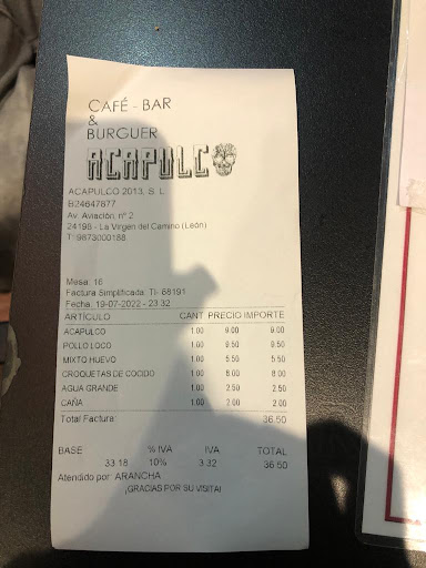 Read moreCuando fuimos nos atendieron fatal Una chica mal humorada según indica el tiket de nombre ARANCHA cuyos modales y educación brillaban por su ausencia La comida bastante mal Dos Hamburgesas, unas croquetas y un sándwich Las croquetas de cocido eran una masa pastosa con sabor rancio Las hamburguesas muy hechas pasadas como la suela de un zapato EL sándwich lo único aceptable de lo que pedimos