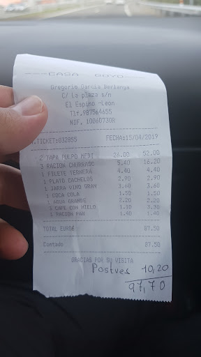 Read moreLlegue de una visita por los Ancares y me habían hablado del Espino como un sitio de referencia gastronomica en la zona. Siguiendo las referencias ,me decido por Casa Goyo. Al no tener reserva y llegar solo me colocan como pueden y con buena voluntad, pues todas las mesas de su amplio salon estan ocupadas. Centrado en la comida , sus especialidades son el pulpo y el churrasco (por encargo). Pido una mediana de pulpo y cachelos . Al nada lo tengo delante de mi. Solo viendo como vibraba el pulpo se intuye su buen punto. El cachelo exquisito y el pan como el recuerdo del verdadero pan gallego. La racion de pulpo era para dos personas (30€) y al final no pude con los cachelos y deje el pan, con gran pesar. Cafe de pota e invitacion al licor. Las personas que me atendieron fueron cercanas y a la vez supieron estar en su...