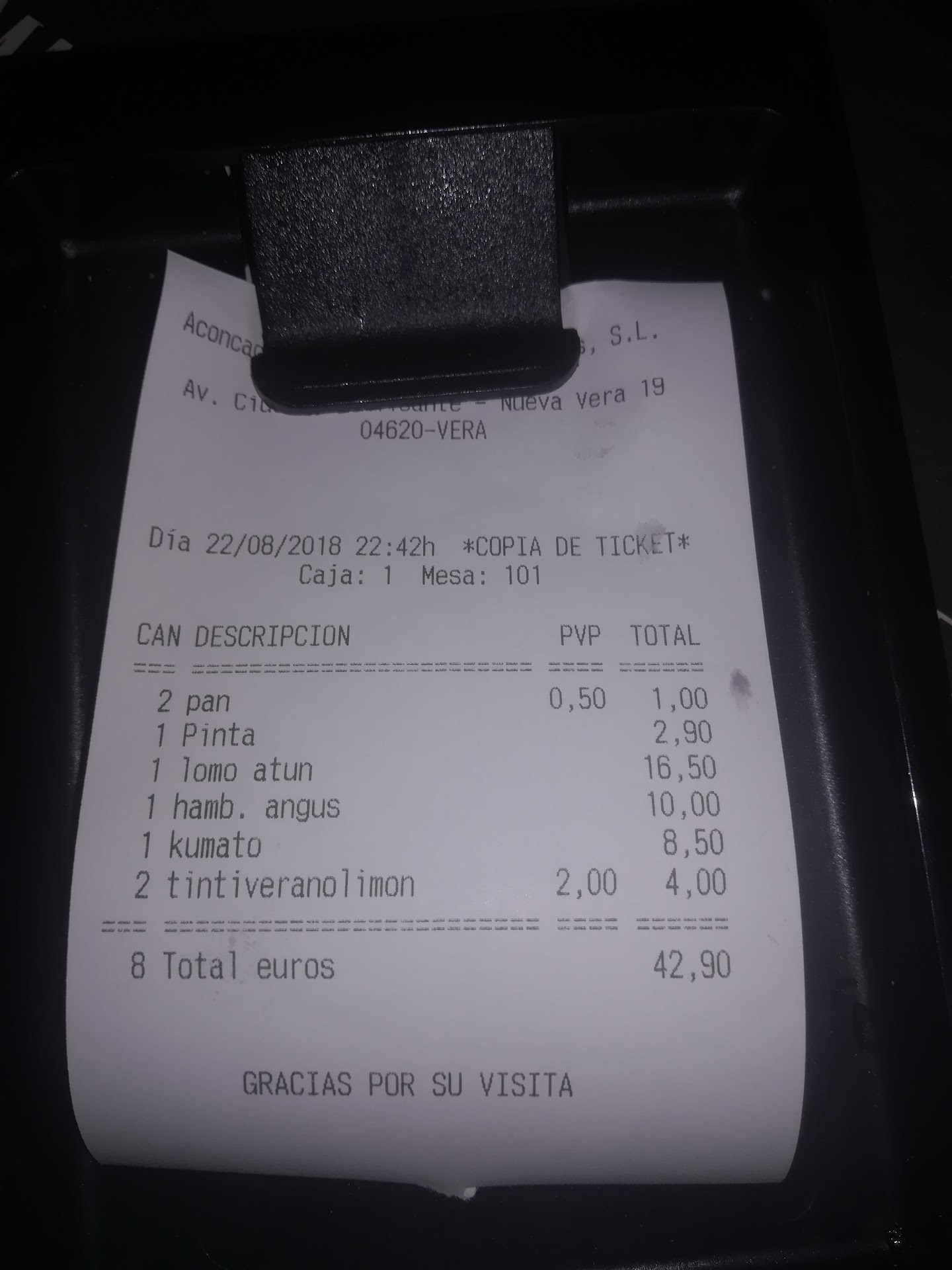 Read moreMi chica y yo llevamos más de una semana por la zona de Vera, Garrucha, Mojacar y puedo decir que este es el peor restaurante en el que hemos estado.