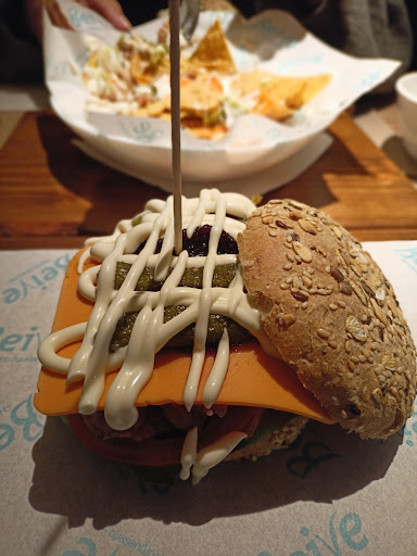 Hay varias opciones veganas en el menú, nosotros decidimos por la opción de montar nuestra propia hamburguesa. Se elige el tipo de pan, la hamburguesa, quesos, salsas, toppings etc. - quedaron súper ricas!