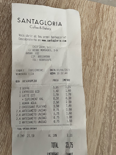 Read moreCómo cafeteria está bastante bien, grande, limpia y bastante bonita!! le pongo dos estrellas por que veo un atraco que por dos donuts me cobren 7,00€ al ver el tiquet que me ponia croisant de platano le pregunte a la dependienta y me dijo, que como no tenia entrado el donuts en la maquina ( cosas que veo fuera de sitio ya que es una cafeteria que venden a diario este producto ) me pico croisant que es el mismo precio!!!!! 3,50€ un donut????? ostras sinceramente parece que te ries de mi! y mas viniendo yo de este mundo se lo que cuesta un donut de 90gr, por eso me siento robado. el café correctoo un arabica y el servicio correcto aunque tuvimos que pedir el crep dos veces por que se le olvido ( cosas que entiendo que pueden pasar aunque no...