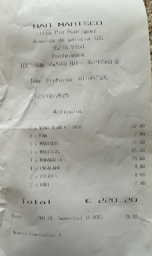 Read moreLamentável! Um bar com aspecto muito simples. Não havia mais ninguém além de nós, num Sábado. Não nos foi apresentada a carta do menu. Apenas nos foi informado que só havia 2 opções de mariscos, mas sequer informou o preço. E a conta foi exorbitante para o que nos foi servido. Uma bandeja de Centollon, uma bandeja de Cigalla e um peixe pequeno - Rodovalho, e duas garrafas de vinho. 220 euros! Não recomendamos esse local para quem espera de um bar, alegadamente com muitas opções de mariscos, com preços...