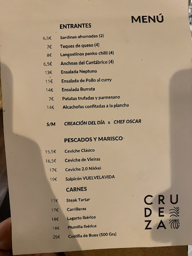 Stumbled into Crudeza because it was closer to our Hotel than any other restaurant. Stroke of luck, really. A small, very well-designed restaurant in a medieval building. Turns out it’s a family affair — the nephew’s your waiter, the uncle’s the cook. The wine selection is awesome. We went for the NENO white, a light, fruity, dry. Service is lovely, we were informed about the size of the dishes, their relative hotness, their ingredients, and got great info on the wines. We had the Anchovies — simply perfect, just the right balance between fish taste and salt — then the Ensalada Neptuno, thinly sliced zucchini, carrots, surimi, avocado, trout caviar and raw tuna inna lime vinaigrette — then the Ceviche Clasico, a divine cod ceviche with just the right amount of cilantro, topped with red onion, white corn and salted corn — had a great entrecôte w/truffled fries, then a hierbas liquor to top things off. All of this for under 100 euro. I‘d visit again any...