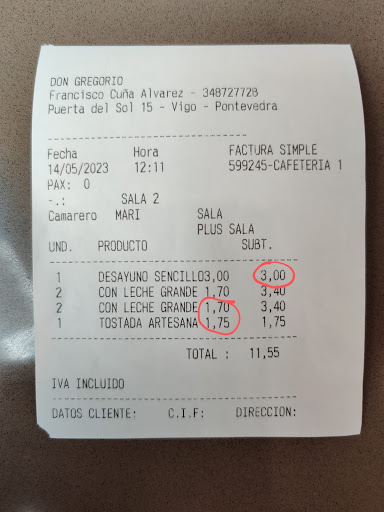 Read moreTudo péssimo! Não só recebemos tratamento diferente por ser turistas como pagamos quase 30€ por 3 tostas mistas, 4 cafés, 2 águas e 1 tortilha, para além de que não tínhamos direito a tapas de ofertas, como os restantes clientes espanhóis. A tortilha estava super salgada e os cafés queimados. Demoravam imenso tempo para nos vir atender. Não recomendo de todo.