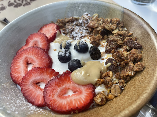 yogur natural con granola y pasas, mantequilla de cacahuete, fresas, y arándanos. El yogur impresionante. Los ingredientes no excesivamente originales. Arriesgan con las pasas, no a todo el mundo le gustan! Nos faltó un poquito más de cantidad de toppings!