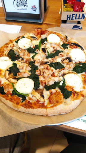 Read moreVoy a felicitar a la plantilla, siempre que he venido me han atendido con una sonrisa, que amables y atentas son las chicas, me han atendido tres o cuatro diferentes pero hay que remarcar que todas lo han hecho fabulosamente, rápidas y muy eficientes también. Nunca he tenido que esperar por la comida, siempre lista y calentita. Un trato de 10. Ahora valoraremos la comida y los precios, dentro de las cadenas de pizzería quizás sean las que más me gusten, muy por encima en calidad que cualquiera de las conocidas, obviamente es una cadena, así que no esperes comer como en un Italiano, los precios a domicilio son desorbitados pero como en cualquier cadena, pagar 25 euros por dos medianas en los tiempos que corren.... Es un robo pero he decir que a recoger es algo más ajustado, aún así a mí por este dinero solo me compensa la pequeña, con la cual como lo suficiente y vale 5 euros, la mediana a recoger te sale por 8 así que a domicilio pagas 9 euros de más... Más de lo que cuesta un taxi 🚕 seguiré llendo a recogerlas mientras mantengan la pequeña a ese precio, pero el resto no compensa, el ambiente lo valoro en temas de atencion ya que no como allí nunca. Recordar que por 3 más de lo que vale una mediana comes primero, segundo, postre, bebida y café. Los precios están fuera de mercado para la calidad, pero remarcó, la pequeña si compensa, comes por 5€ y sales del paso si ese día no tienes...