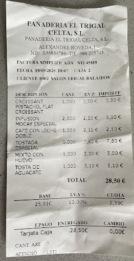 Hemos ido esta tarde al trigal a merendar. Éramos 3 personas. Tardaron 15 minutos en atendernos y cuando por fin llega la camarera, le pedimos 2 cafés pequeños, 1 colacao y 3 pasteles y nos responde: ahh, voy a coger un papel para anotar, y se da media vuelta. Tarda otros 15 minutos en volver, nos toma nota y a los 10 minutos solo nos trae los bollos (lo normal es traer primero la bebida y luego lo sólido, pero bueno) además nos trajo uno de los bollos mal. Después de otros 10 minutos trae los 2 cafés pequeños y el colacao, para mi sorpresa la leche la trajo de vaca (cuando se había llevado apuntado soja en su notita y los 2 cafés de mis compañeros estaban helados). Le pido que me traiga la soja y que traiga leche caliente para los cafés, tardó otros 15 minutos, ya nos habíamos acabado los bollos y sin nada para beber. La leche la volvió a traer casi fría, y los cafés de mis compañeros ya estaban aguados de tanta leche, eran intomables, así le quedaron enteros. Muy descontentos le pedimos la cuenta, tardó otros 15 minutos. Que camarera mas lenta en serio. Es una pena que la poca profesionalidad de un empleado, deje la mala fama al local, era una camarera portuguesa creo, era extranjera y pienso que no sabe trabajar como camarera, con un trato como ese dan ganas de no volver más. Cuando nos trae la cuenta casi caemos de espaldas del susto. Para llevar el precio de la bollería está genial y es de buena calidad el producto, pero te cobran más caro para tomarlo allí y plus más por ser en la terraza. Una barbaridad en serio! Entre el mal trato de la camarera y el precio, nos voveremos a este local. A continuación les dejo la cuenta de lo que hemos tomado, 2 cafés pequeños, un colacao y 3 bollos. Una gran decepción en serio, más les vale cambiar de personal, porque si a cada mesa que atiende les lleva erróneo lo que piden tantas cosas, se quedarán...